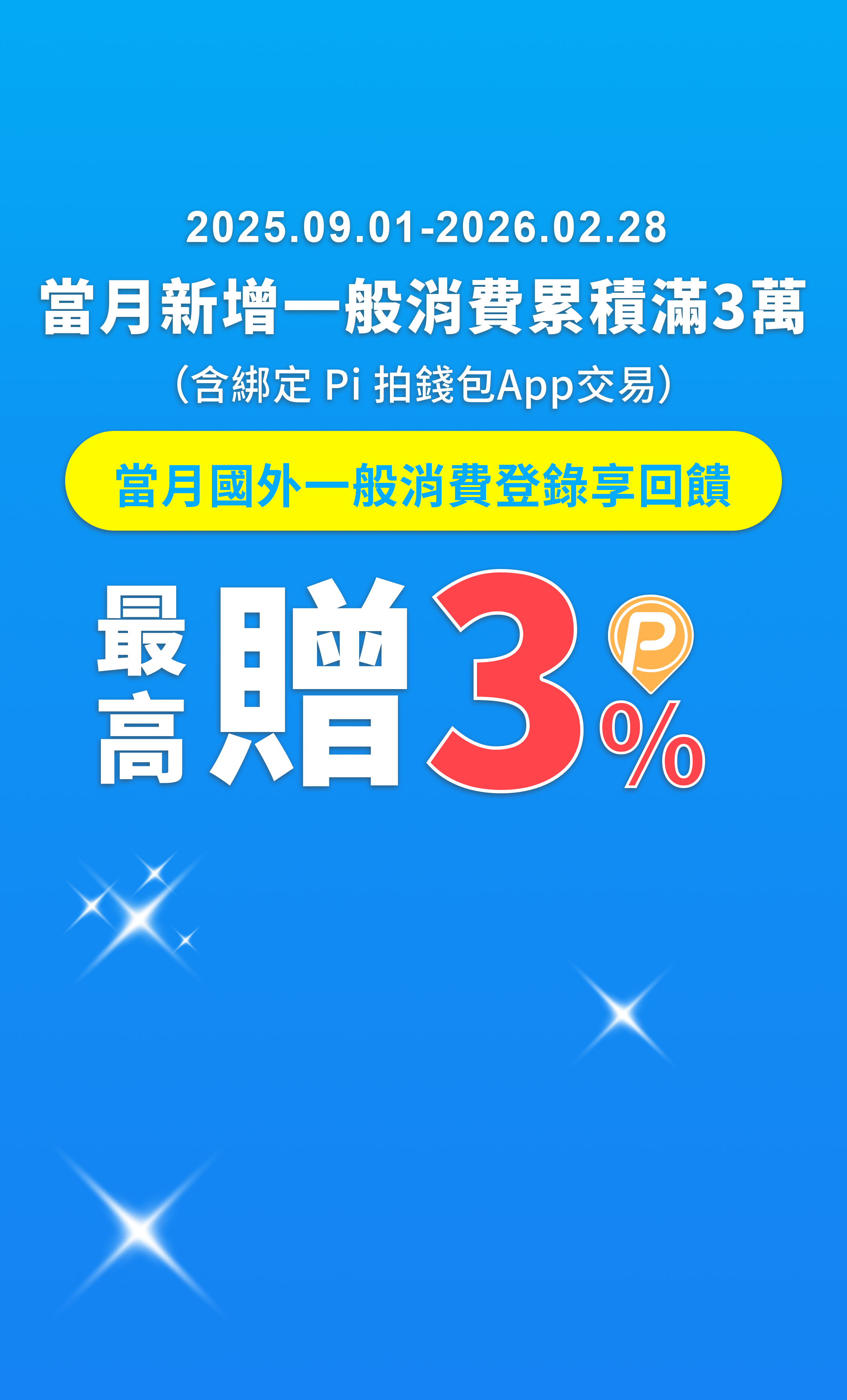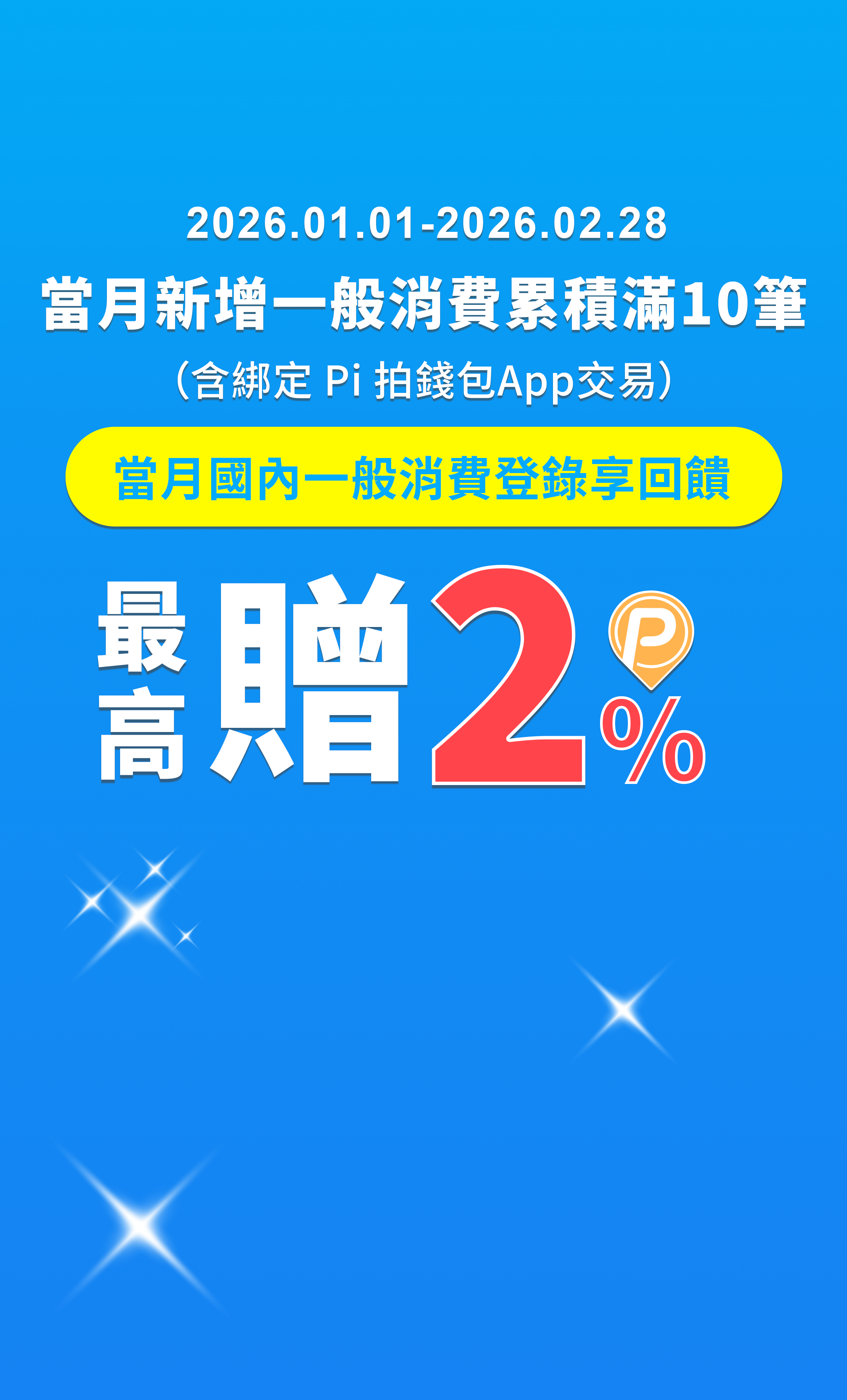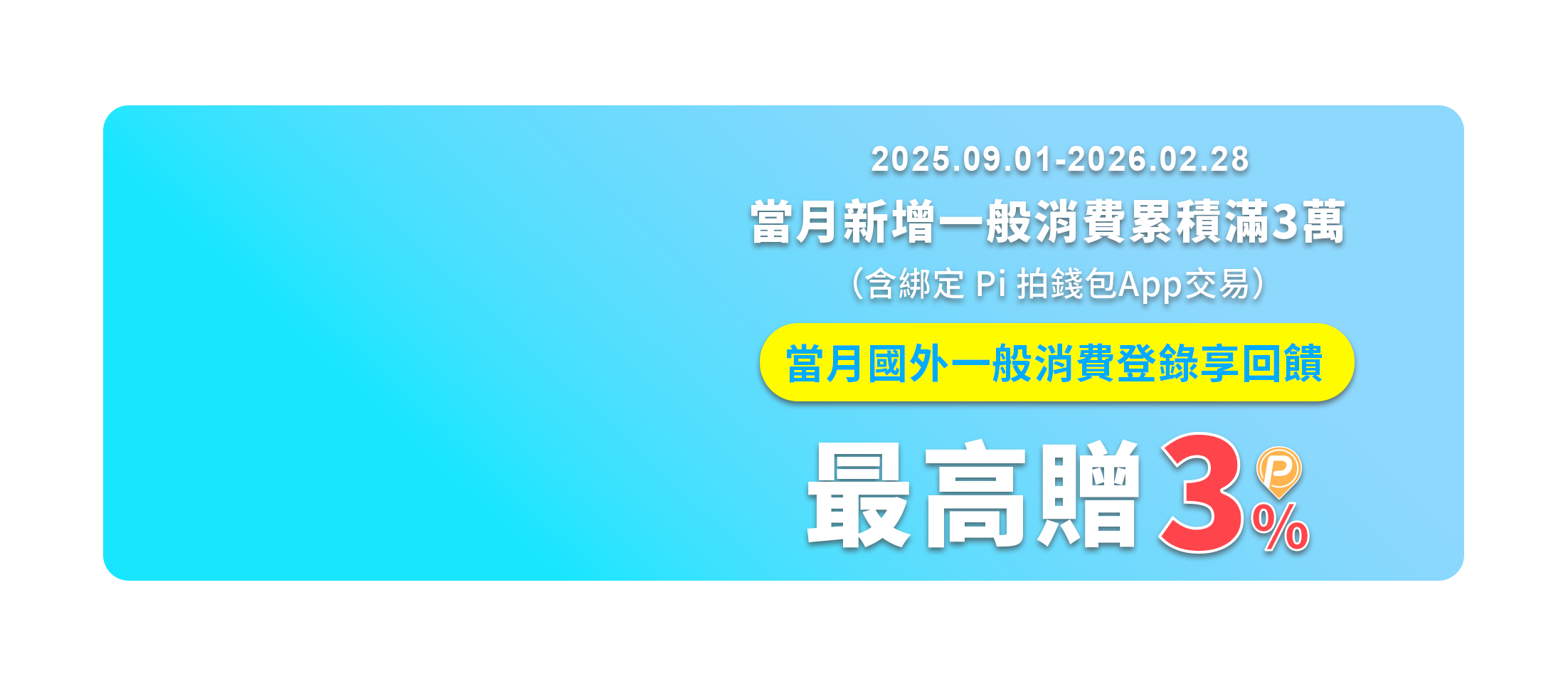 回饋無上限 ※ 2024/1/1起特店分期之交易不享原卡片基本回饋1% P幣 (公告) ※綁定 Pi 拍錢包APP於全家便利商店享國內一般消費1% P幣回饋無上限(首刷禮、推薦禮及滿額活動不列入計算)。 |